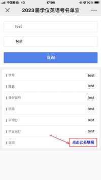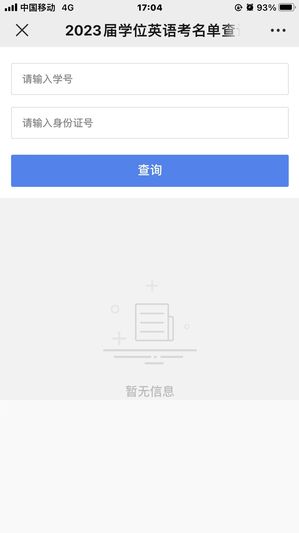 3、在“2023届学位英语考名单查询”模块中,输入学号和身份证号(末尾X须大写),点击查询。如不符合上述申请条件1-3,则查询不到个人信息。