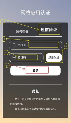 2、如果出现“网络应用认证”页面,请务必先选择手机短信验证。接下来,输入自己的手机号,然后点击发送,等手机接收到验证码之后,输入验证码,最后点击登录。