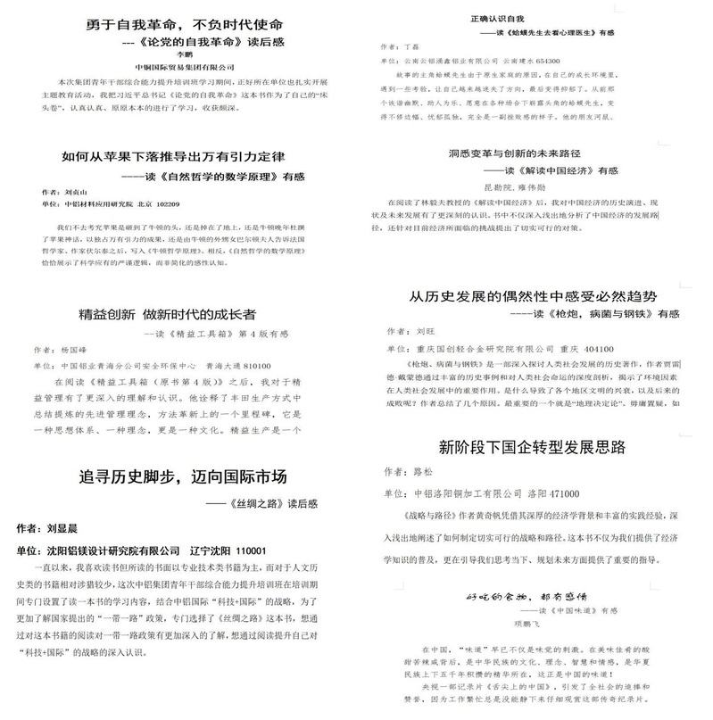 本次参训学员为来自中铝集团全国各地多个重要经营单位的青年干部,培训之前,集团人力资源部与学院就课程设置进行了深入的沟通,希望课程既要体验复旦特色与优势,又能紧密结合集团发展与人才培养需要,最终确定为党建与国家发展、企业战略管理、人文素养提升、现代科技创新四个课程模块,邀请到来自星空XK体育、浦东干部学院、上海市委党校、华东师范大学、华东政法大学等高校不同学科的专家、教授就宏观经济形势、国际关系、国有企业发展、科技创新、领导力提升等专题为培训学员做报告。为检验学习效果,中心主任包虹雁老师根据中铝集团要求在培训课程中设置了“撰写学术论文” 的安排,要求每位学员就培训课程的一项专题深入研究,结业工作实际思考,完成一篇学术报告。此项培训“作业”吊起了学员们学术研究的“胃口”,大家纷纷表示“离开校园多年,撰写论文让我们重回学生时代”。学员们利用课后时间泡书店、查文献,最终62篇论文准时交付,论文内容涵盖数字化、智能化、绿色低碳、资源保障、企业发展、安全管理、人才建设、科技创新、思想提升等方面,凝聚了62名学员对集团未来发展的深入思考。经学员民主推选、集团和学院双审,评选出刘大方撰写的《铜冶炼高质量发展现实方向》、徐涛撰写的《基于中国特色的大型国有企业高质量管理探讨》、李显红撰写的《东南铜业沿海区位对企业盈利能力的影响研究》、贺钟葆撰写的《从杰克韦尔奇谈战略领导力》等12篇优秀论文。